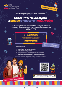 Drodzy rodzice i opiekunowie! Zastanawiacie się, jak urozmaicić ferie zimowe swoim dzieciom? ❄️Przychodzimy z pomocą!Klub Cyfrowych Możliwości zaprasza uczennice i uczniów klas IV-VIII szkół podstawowych na bezpłatne 4-dniowe warsztaty z zakresu nowych technologii! 💻W programie:...