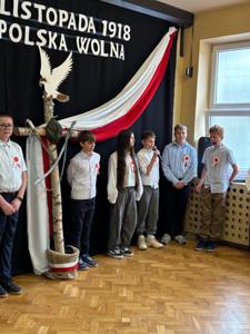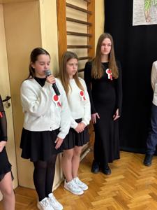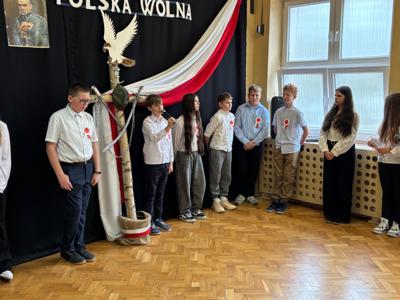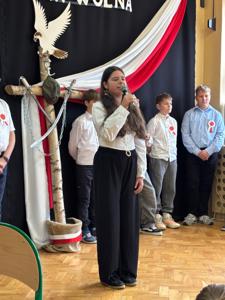 Nasza społeczność szkolna miała zaszczyt uczestniczyć w bardzo ważnej akademii przygotowanej przez uczniów klasy szóstej pod opieką wychowawcy p. Stanisława Pietrasiaka. Na scenie wystąpiła również uczennica klasy siódmej, która zaśpiewała utwór "Białe róże" oraz uczennica klasy ósmej, która wyrecytowała "Inwokację".