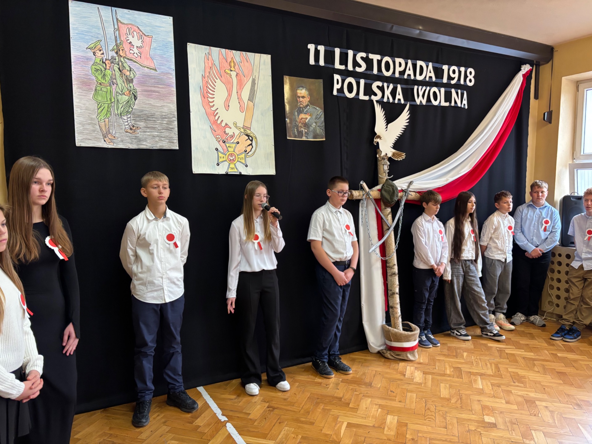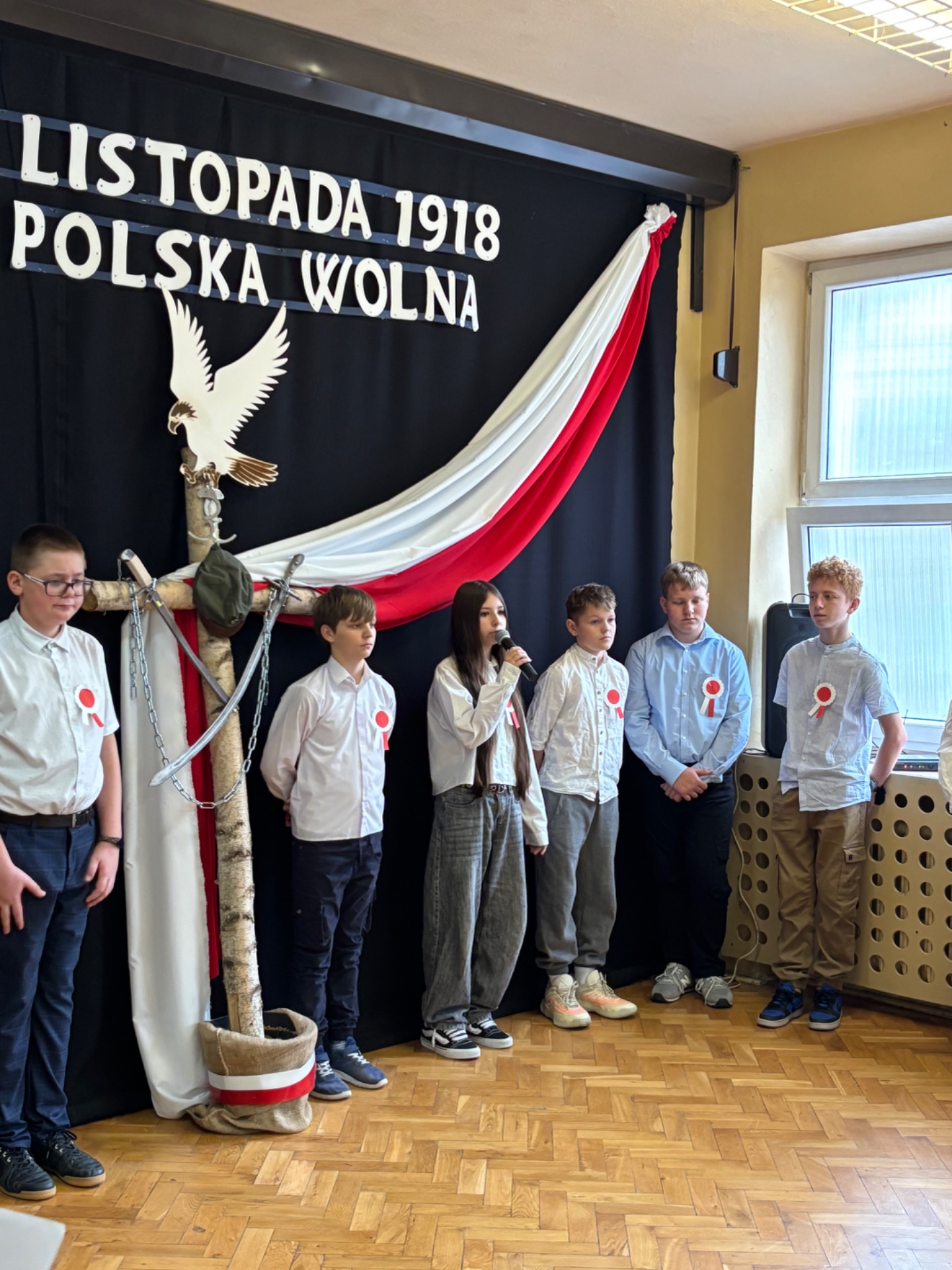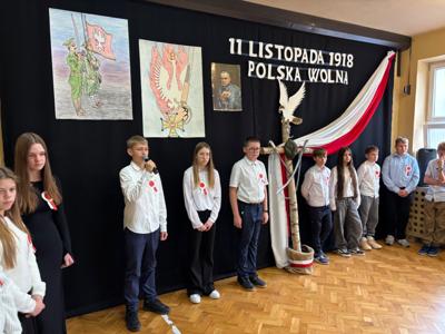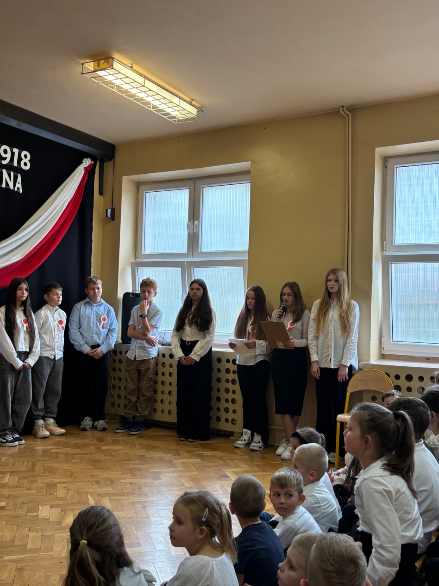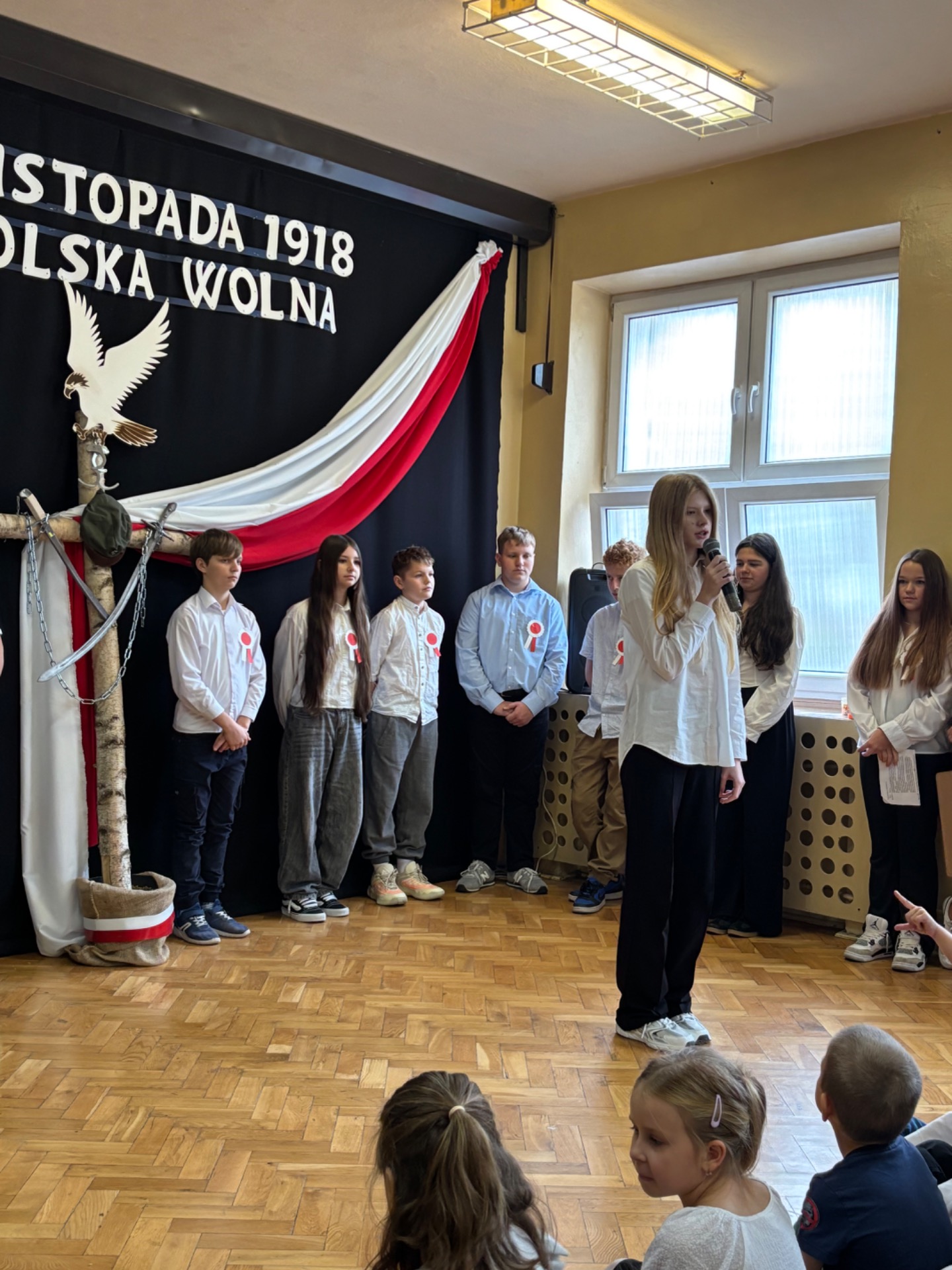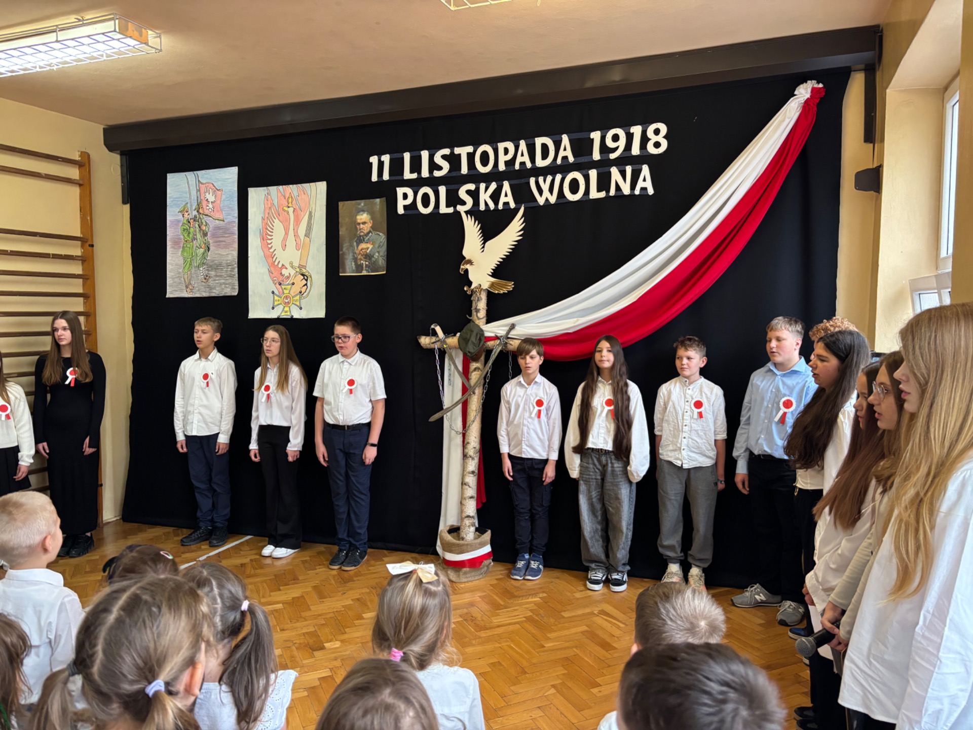 Uroczystość, która odbyła się pod hasłem „Polska Wolna”, była wspaniałą lekcją historii i patriotyzmu. Szóstoklasiści przygotowali poruszający montaż słowno-muzyczny, który przypomniał nam o znaczeniu wolności i konieczności pielęgnowania pamięci o tych, którzy walczyli o niepodległość naszej Ojczyzny. Uczniowie z wielkim zaangażowaniem recytowali wzruszające utwory patriotyczne. Sala rozbrzmiewała dźwiękami pięknych pieśni wykonywanych przez uczniów klas IV - VII, których akompaniament, grany na akordeonie, dodawał występowi wyjątkowo podniosłej atmosfery. Każda klasa pod okiem p. Stanisława Pietrasiaka przygotowała inną pieśń.