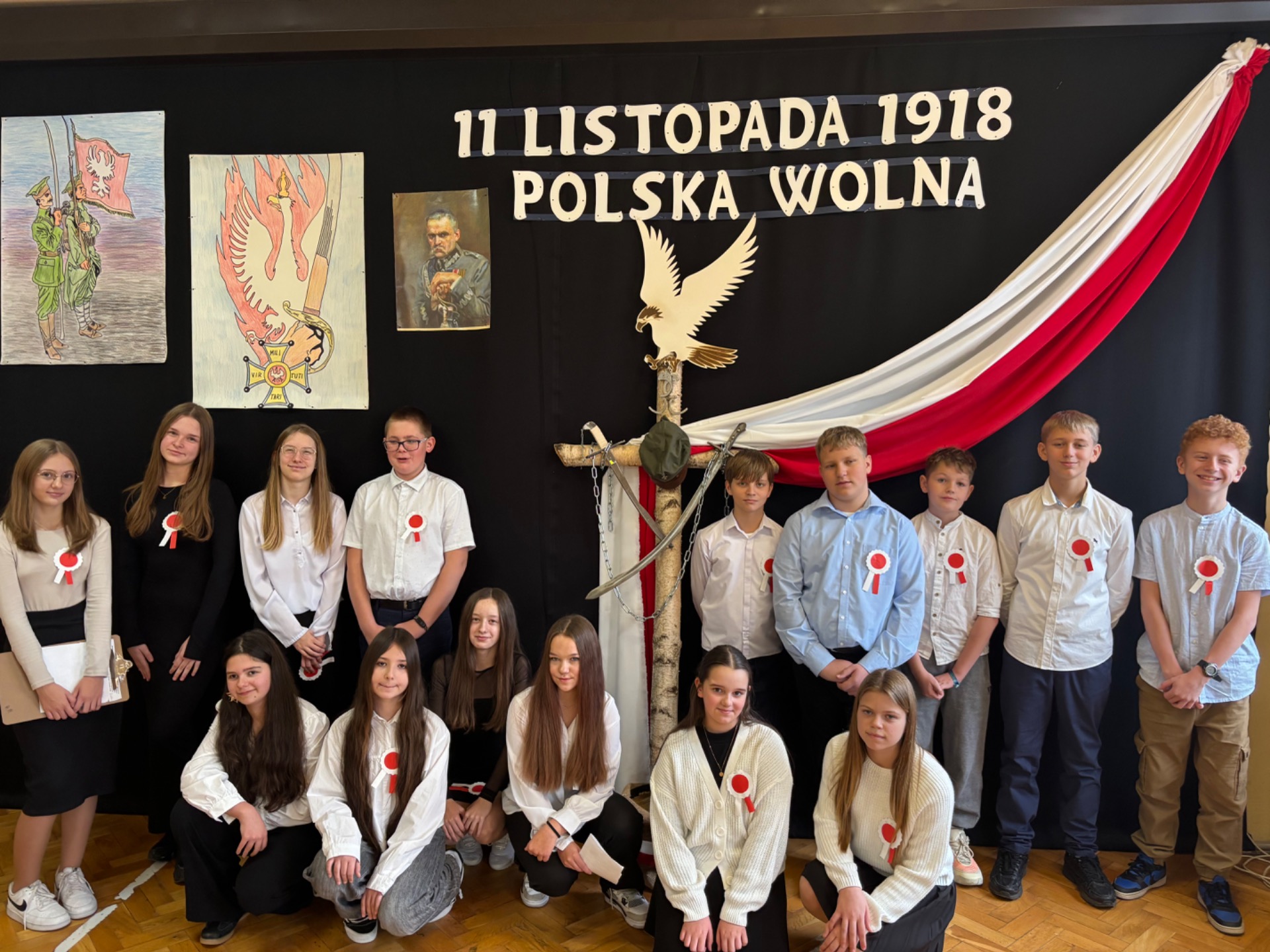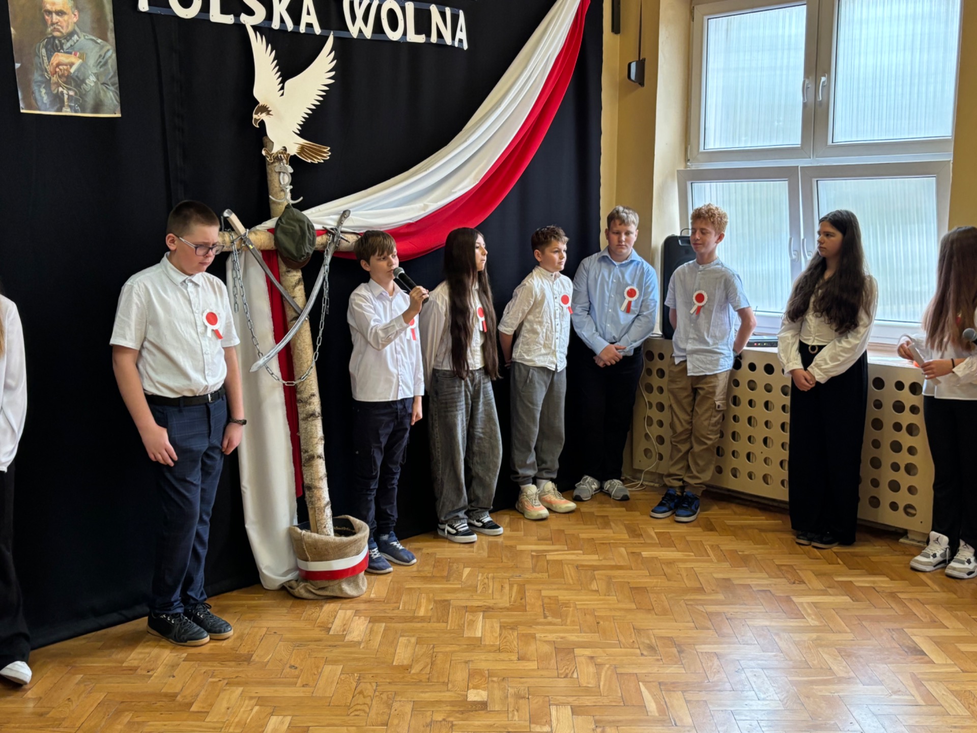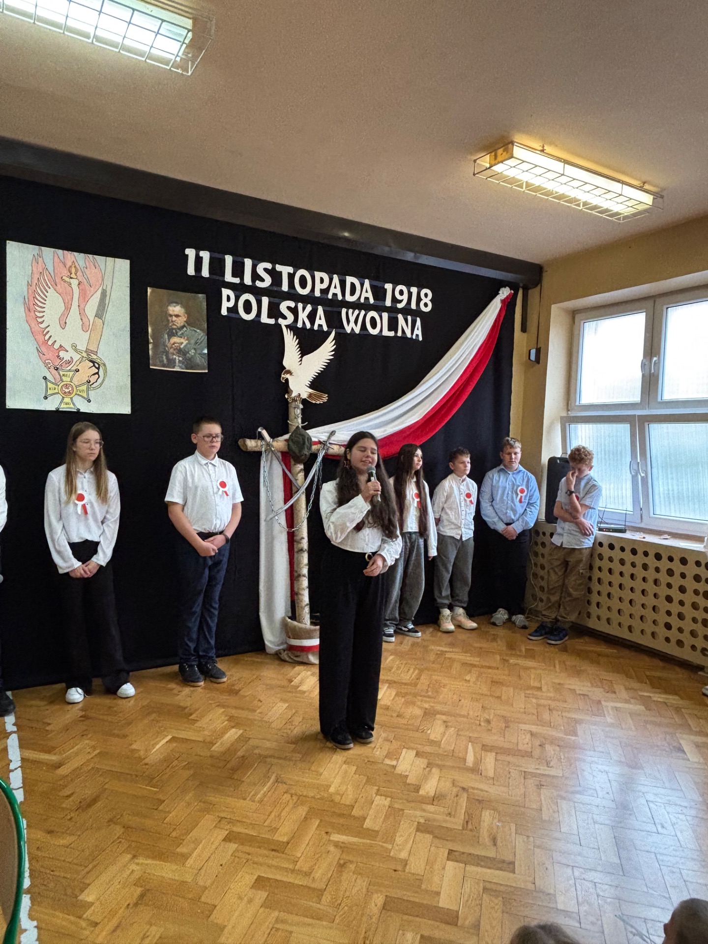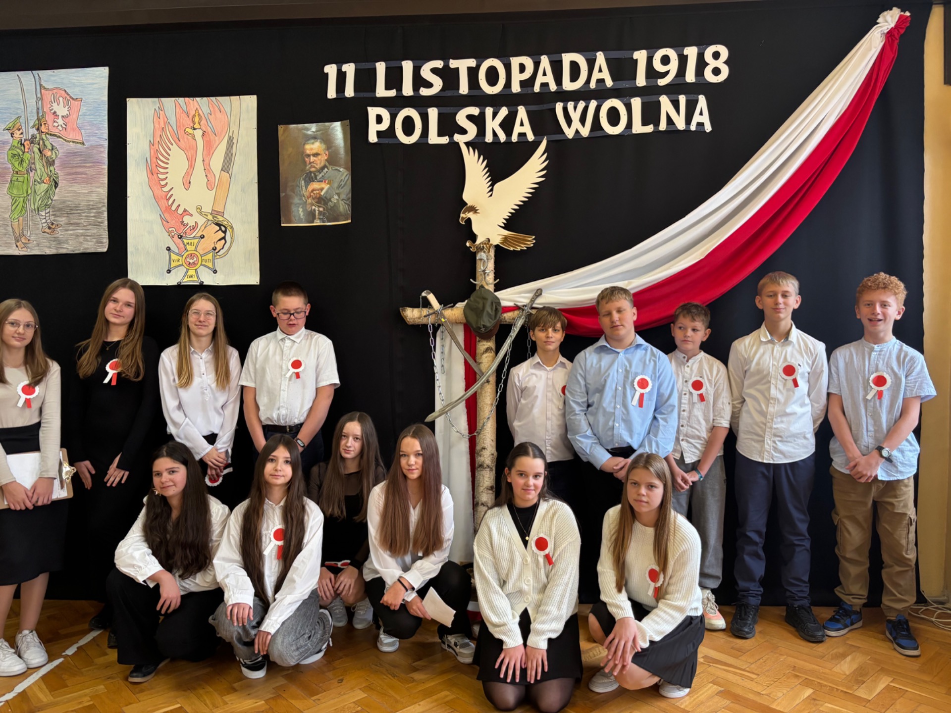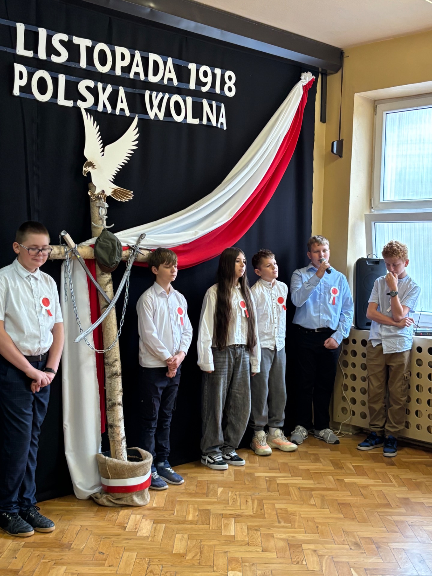 Uroczystość, która odbyła się pod hasłem „Polska Wolna”, była wspaniałą lekcją historii i patriotyzmu. Szóstoklasiści przygotowali poruszający montaż słowno-muzyczny, który przypomniał nam o znaczeniu wolności i konieczności pielęgnowania pamięci o tych, którzy walczyli o niepodległość naszej Ojczyzny. Uczniowie z wielkim zaangażowaniem recytowali wzruszające utwory patriotyczne. Sala rozbrzmiewała dźwiękami pięknych pieśni wykonywanych przez uczniów klas IV - VII, których akompaniament, grany na akordeonie, dodawał występowi wyjątkowo podniosłej atmosfery. Każda klasa pod okiem p. Stanisława Pietrasiaka przygotowała inną pieśń.