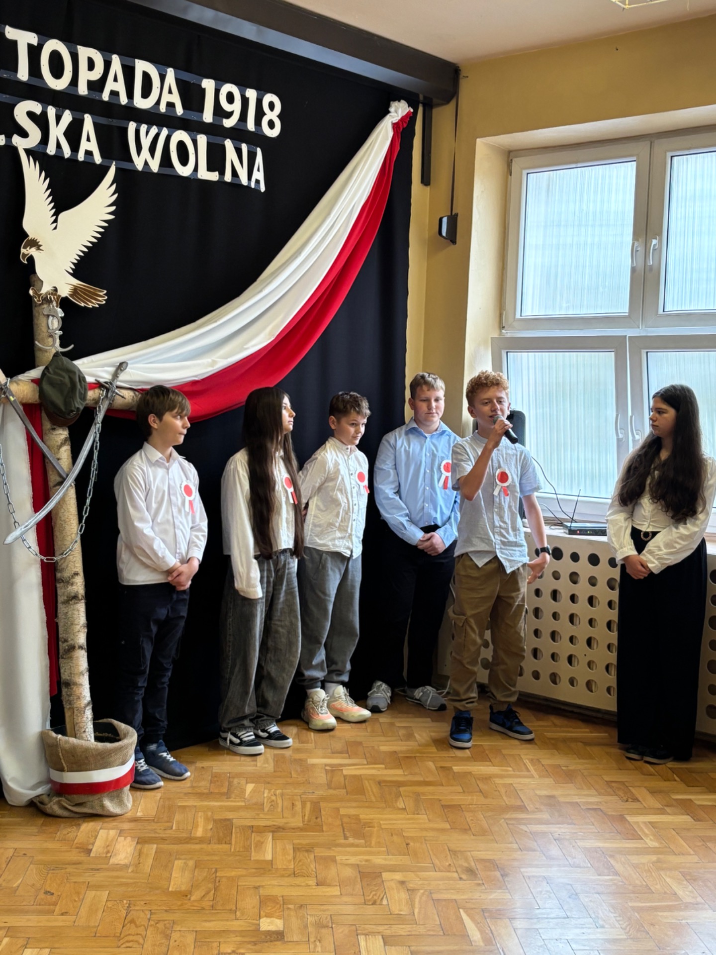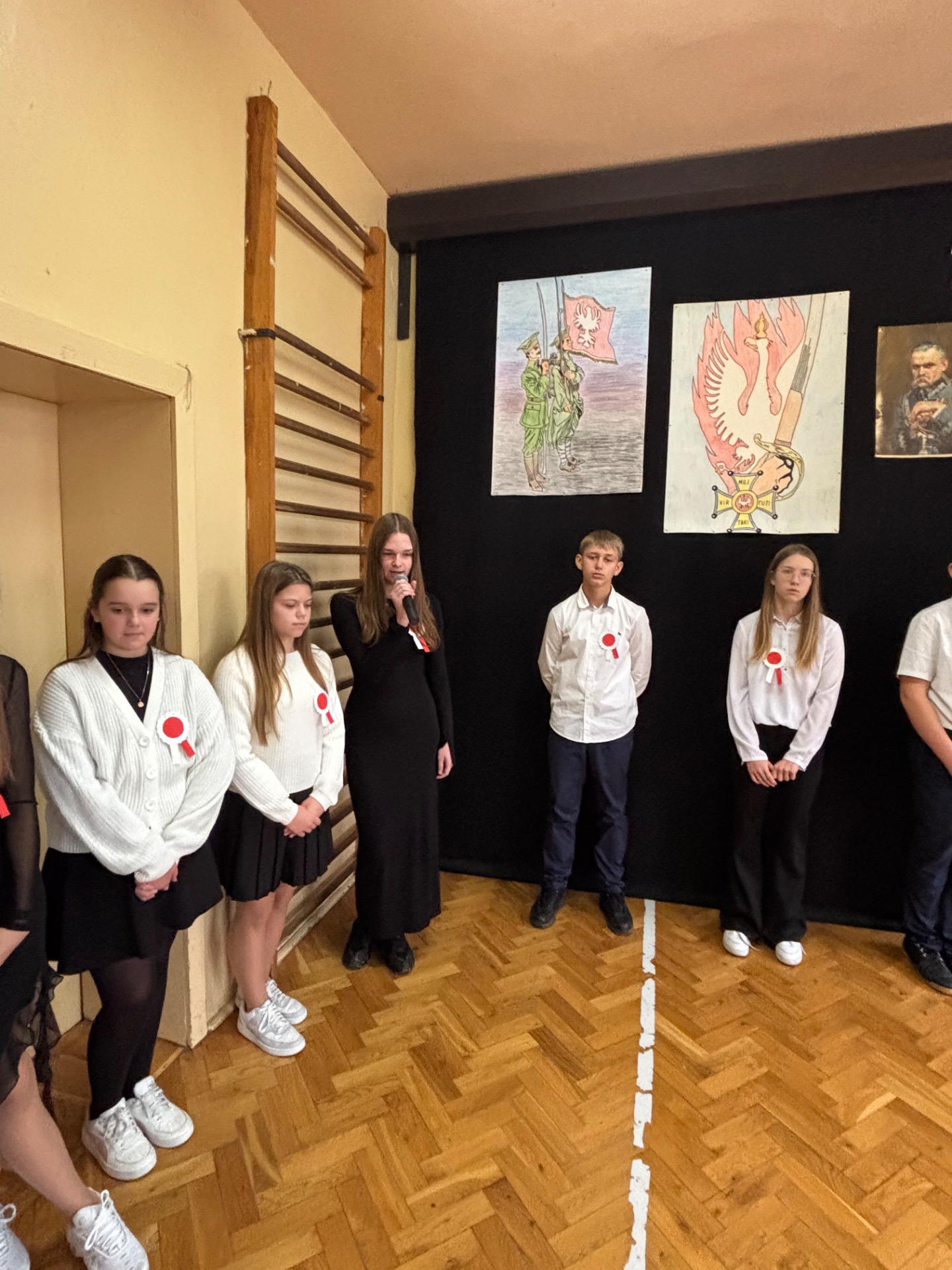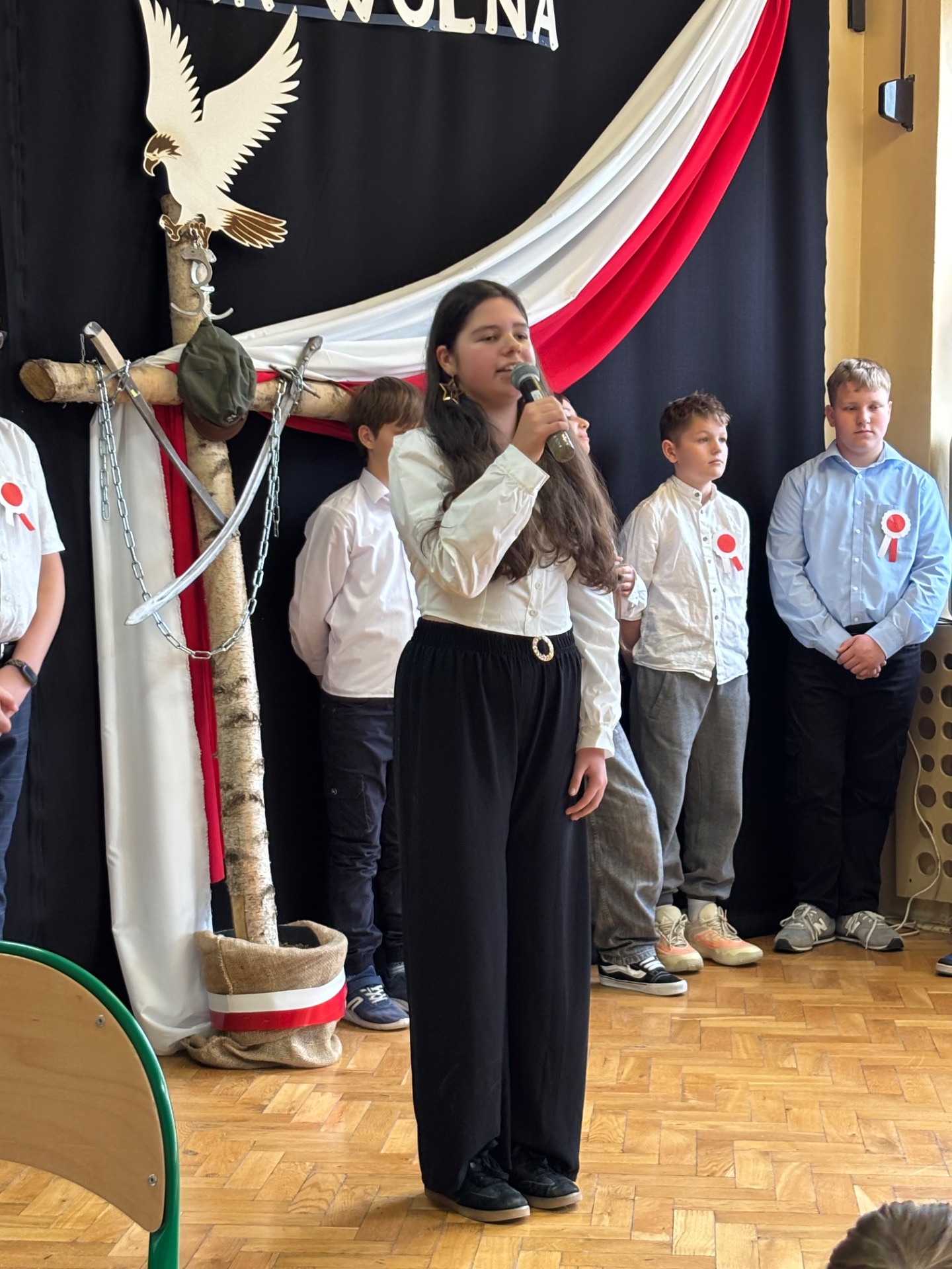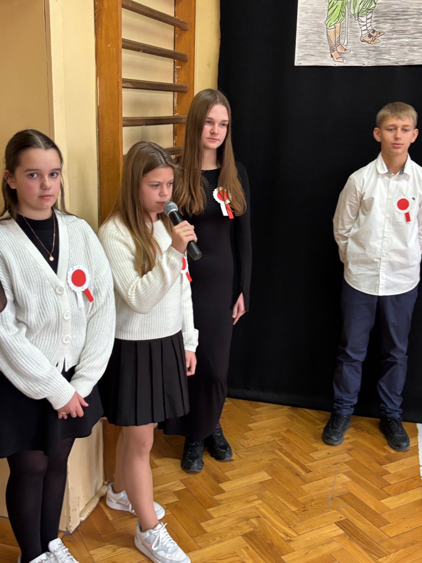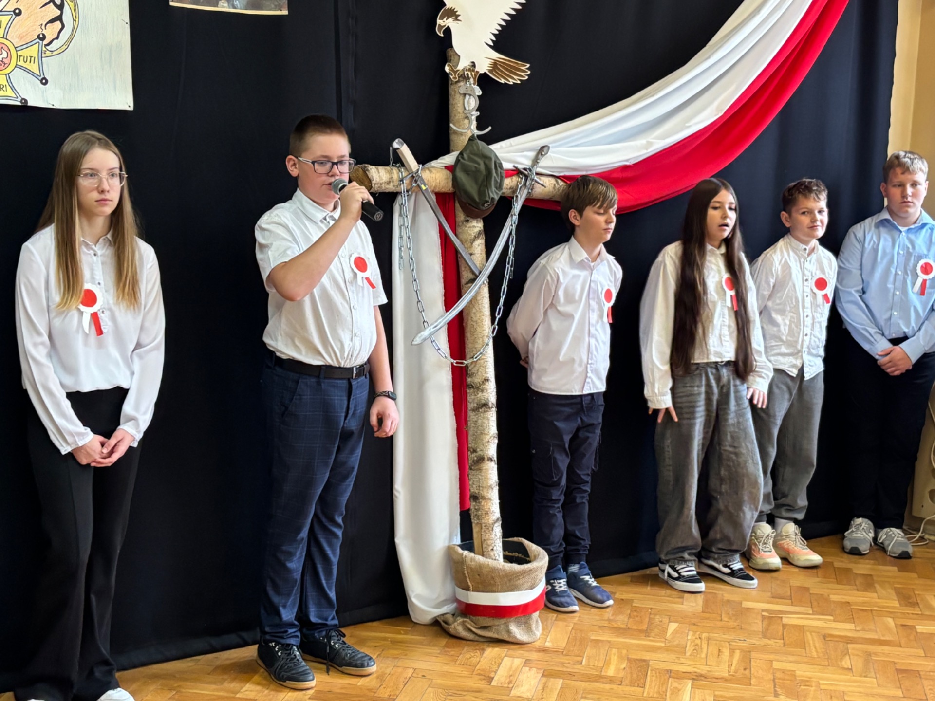 Uroczystość, która odbyła się pod hasłem „Polska Wolna”, była wspaniałą lekcją historii i patriotyzmu. Szóstoklasiści przygotowali poruszający montaż słowno-muzyczny, który przypomniał nam o znaczeniu wolności i konieczności pielęgnowania pamięci o tych, którzy walczyli o niepodległość naszej Ojczyzny. Uczniowie z wielkim zaangażowaniem recytowali wzruszające utwory patriotyczne. Sala rozbrzmiewała dźwiękami pięknych pieśni wykonywanych przez uczniów klas IV - VII, których akompaniament, grany na akordeonie, dodawał występowi wyjątkowo podniosłej atmosfery. Każda klasa pod okiem p. Stanisława Pietrasiaka przygotowała inną pieśń.