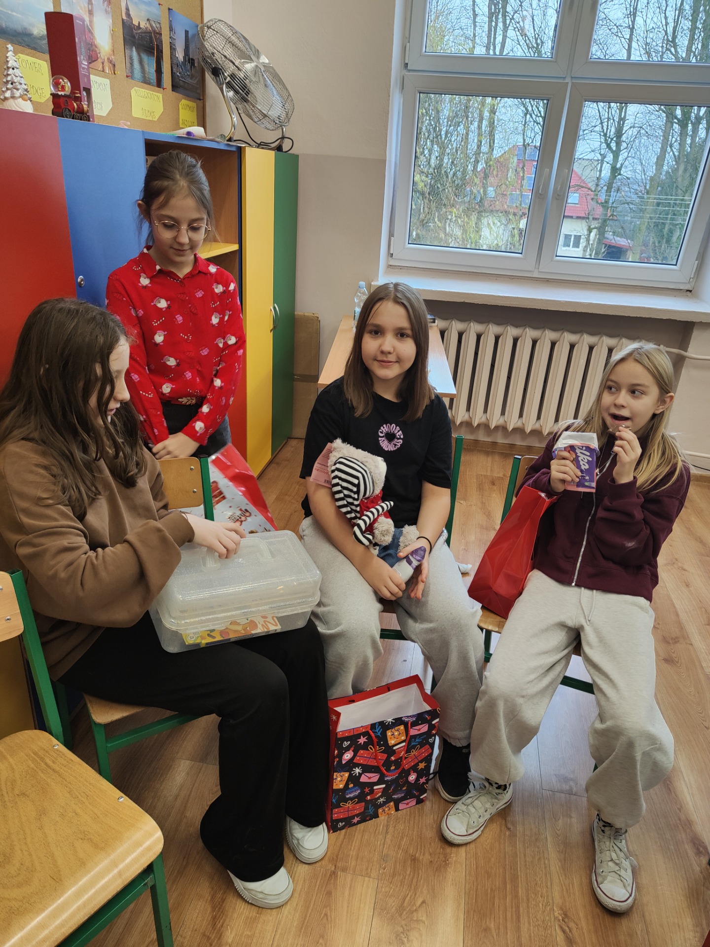 Z niewielkim opóźnieniem, ale radośnie klasa piąta świętowała mikołajki. Prezenty ucieszyły wszystkich. Każdy uczeń otrzymał coś, o czym marzył. Radość zagościła na twarzach wszystkich dzieci.