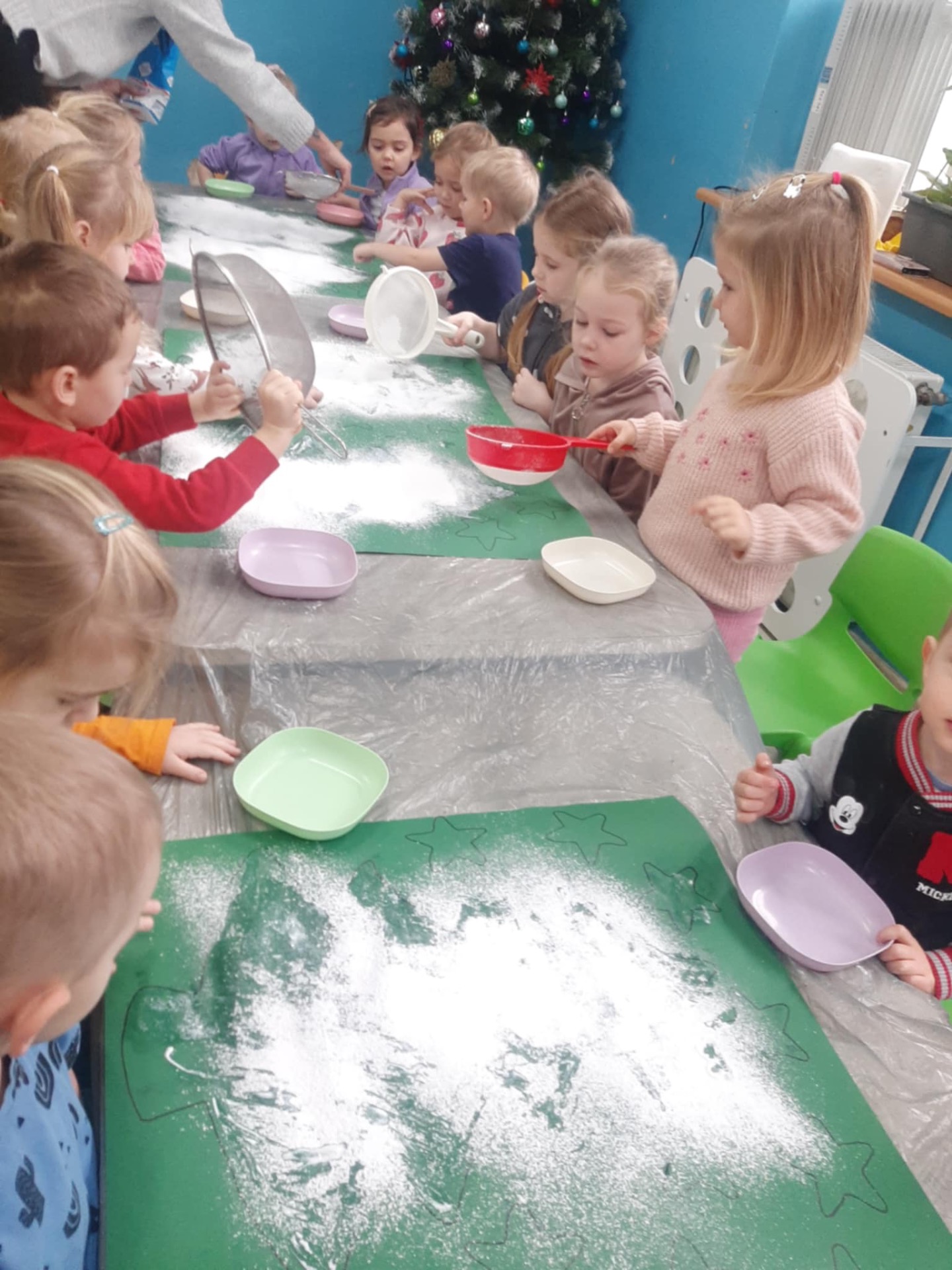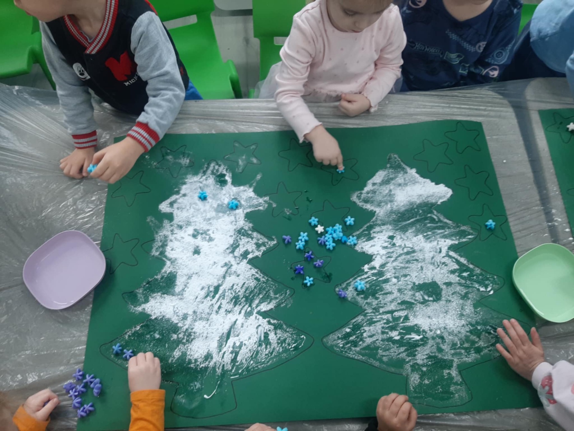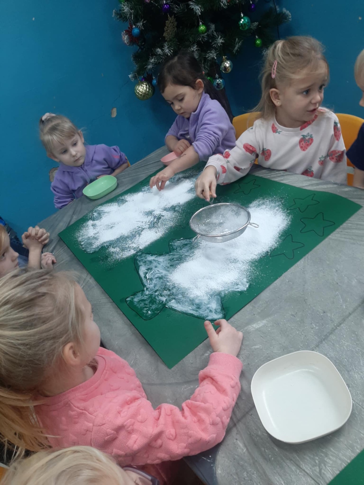 Przedszkolaki ozdabiały przygotowane papierowe choinki, wykorzystując do tego cukier puder oraz kolorowe chrupki. Dzieci mogły dotykać, przesypywać, rozcierać i przyklejać materiały, eksperymentując z ich fakturą i wyglądem. Zajęcia dostarczyły im wiele radości, a jednocześnie wspierały rozwój motoryki małej, koordynacji wzrokowo-ruchowej i kreatywnego myślenia.