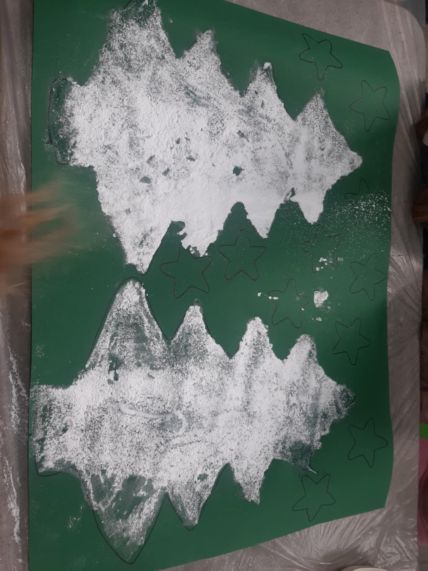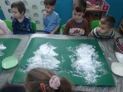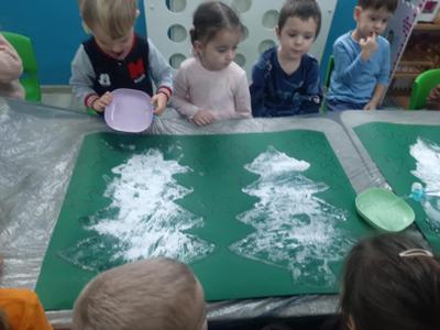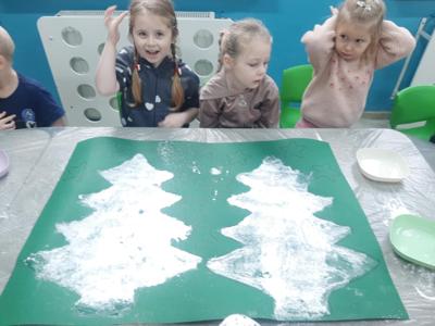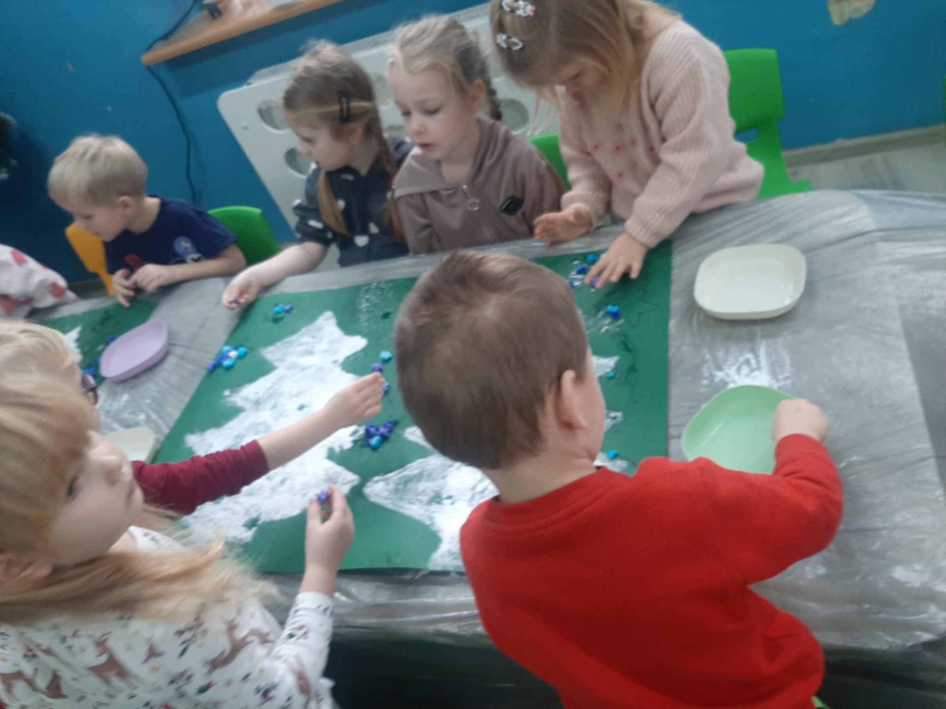 Przedszkolaki ozdabiały przygotowane papierowe choinki, wykorzystując do tego cukier puder oraz kolorowe chrupki. Dzieci mogły dotykać, przesypywać, rozcierać i przyklejać materiały, eksperymentując z ich fakturą i wyglądem. Zajęcia dostarczyły im wiele radości, a jednocześnie wspierały rozwój motoryki małej, koordynacji wzrokowo-ruchowej i kreatywnego myślenia.