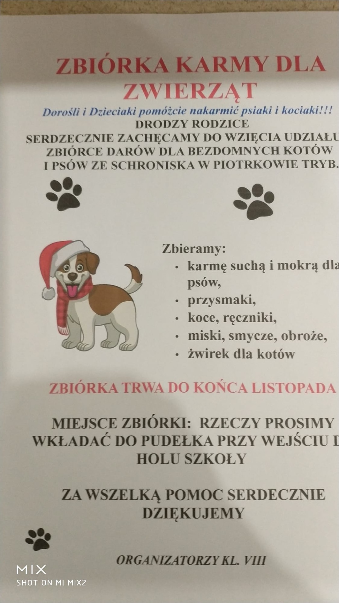 Społeczność naszej szkoły często angażuje się w różne akcje charytatywne, tym samym okazując wielkie serce i wsparcie dla potrzebujących. Tym razem uczniowie klasy ósmej wraz z wychowawczynią zorganizowali zbiórkę na rzecz Schroniska dla Bezdomnych Zwierząt w Piotrkowie Tryb. Celem akcji było przede wszystkim zebranie potrzebnych schronisku rzeczy (m.in.: karmy, smyczy, obroży, koców). Zbiórka miała również uświadomić uczniom, jak ważna jest bezinteresowna pomoc i zwrócić uwagę na potrzeby porzuconych zwierząt. 15 grudnia chłopcy: Mikołaj, Bartek, Adam, Filip, Igor, Marcel, Igor dostarczyli zebrane dary do schroniska. Było to możliwe dzięki pomocy rodzica p. Zbigniewa Tokarka, który pomógł w logistyce dostarczając busem zebraną karmę. Dzięki wspólnemu wysiłkowi udało się zebrać 115 kg suchej karmy, 85 puszek mokrej karmy, oraz wiele innych potrzebnych artykułów dla czworonożnych podopiecznych schroniska. Na zakończenie wizyty schronisko uhonorowało nas pamiątkowym dyplomem z podziękowaniami.