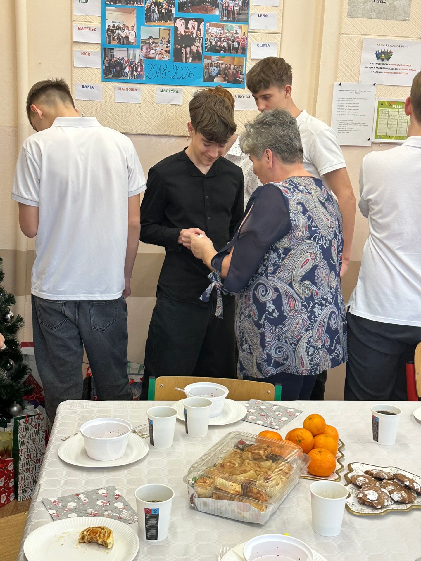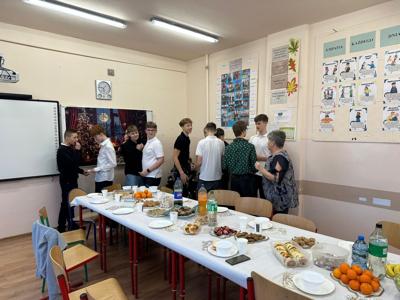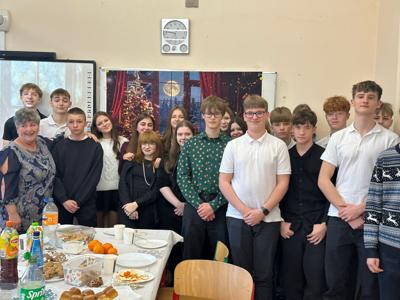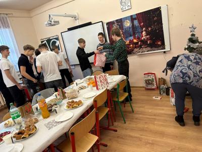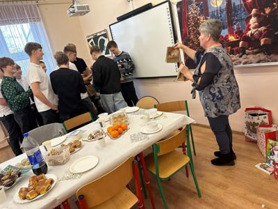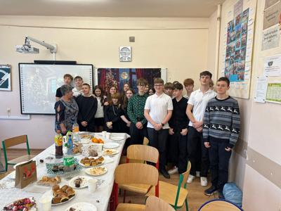 W ostatnim dniu nauki przed Bożym Narodzeniem w klasie 8 odbyła się wigilia klasowa. W tym roku miała ona szczególny charakter, ponieważ była ostatnią w takim gronie i w murach tej szkoły. Uczniowie i ich rodzice oraz dziadkowie przygotowali tradycyjne dania wigilijne, jak barszcz z uszkami, paszteciki, pierogi z kapustą i grzybami, rybę. Nie zabrakło również pierniczków, ciast, ciasteczek, babeczek, sałatek czy przekąsek. Dania były wyborne i bardzo smakowite. Uczniowie składali sobie świąteczne życzenia, śpiewali kolędy oraz dzielili się opłatkiem, pielęgnując piękne polskie tradycje. Nie zabrakło oczywiście świątecznych upominków, które czekały pod choinką. To był niezapomniany dzień. Nasza ostatnia wspólna wigilia w murach Szkoły Podstawowej w Uszczynie. Cudowne wspólne chwile. Będziemy tęsknić do takich momentów. Po wspólnej biesiadzie udaliśmy się na szkolne jasełka, w których swoje talenty aktorskie zaprezentowali uczniowie klasy siódmej.